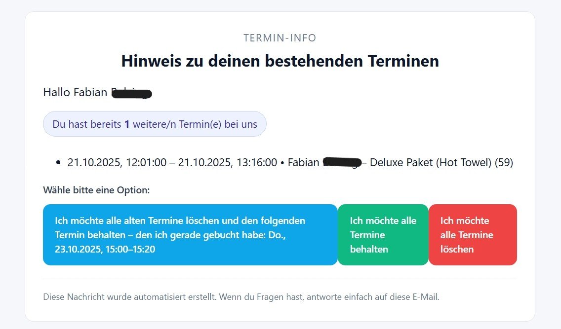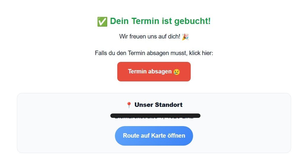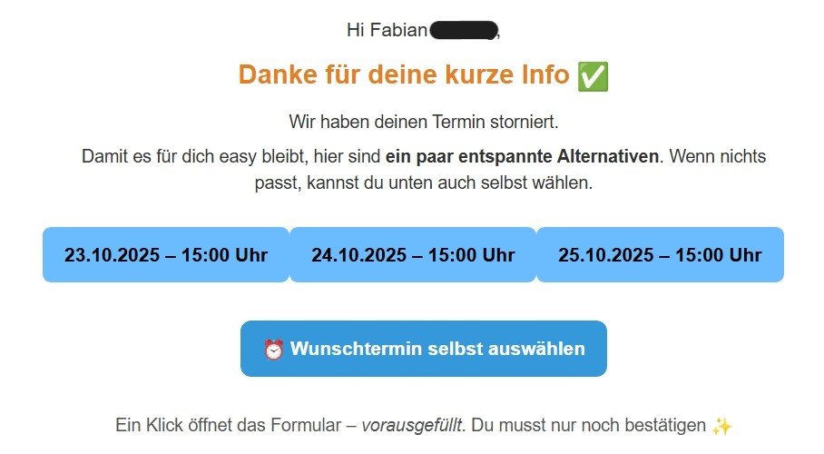 Kunde bekommt Bestätigung + Stornomöglichkeit per E-Mail (1 Klick).