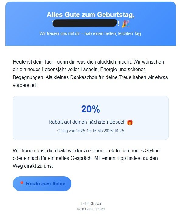 - Kein Spam: nur erschienene Kund:innen werden angeschrieben.